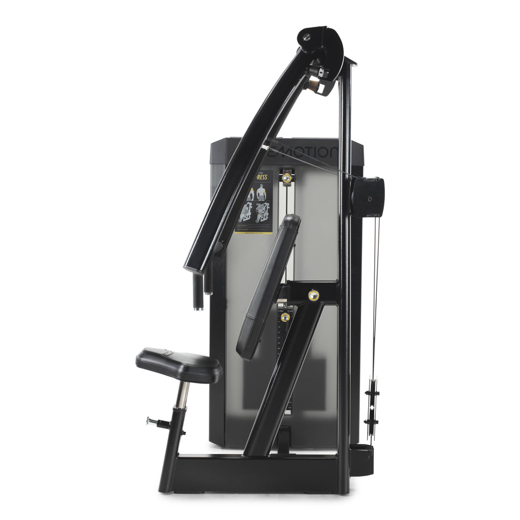 Siedzisko oraz oparcie wyściełane są miękką, profilowaną pianką, która zapewnia stabilizację i wygodę nawet podczas intensywnych serii. Uchwyty możesz złapać na kilka sposobów, co pozwala aktywować różne partie mięśni klatki piersiowej w zależności od ustawienia dłoni. Maszyna wyposażona jest w zamknięty stos obciążeniowy, co ogranicza dostęp do ruchomych części i zwiększa bezpieczeństwo użytkowania. Intuicyjna regulacja i wygodne ustawienia sprawiają, że sprzęt jest przyjazny dla każdego, niezależnie od poziomu zaawansowania.