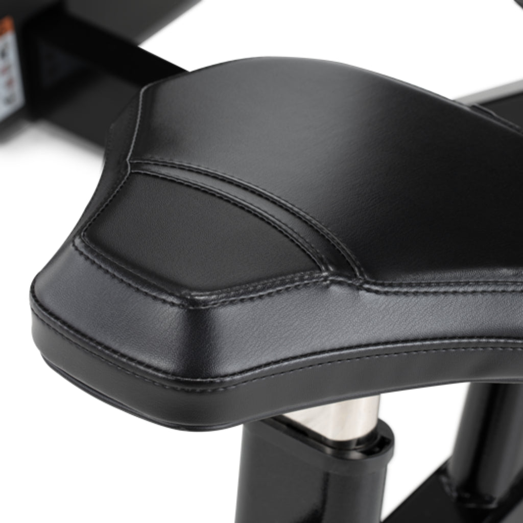 Maszyna umożliwia regulację siedziska oraz podparcia pleców, co pozwala na idealne dopasowanie ustawienia do wzrostu i budowy ciała użytkownika. Wyprofilowane elementy kontaktowe zapewniają stabilność i wygodę, nawet podczas pracy z dużymi obciążeniami. Ergonomiczne uchwyty ułatwiają pewny chwyt i kontrolę nad ruchem, co pozwala skupić się na prawidłowej technice wykonywanych ćwiczeń. Całość konstrukcji została stworzona z myślą o komforcie i bezpieczeństwie użytkownika w trakcie każdej sesji treningowej.