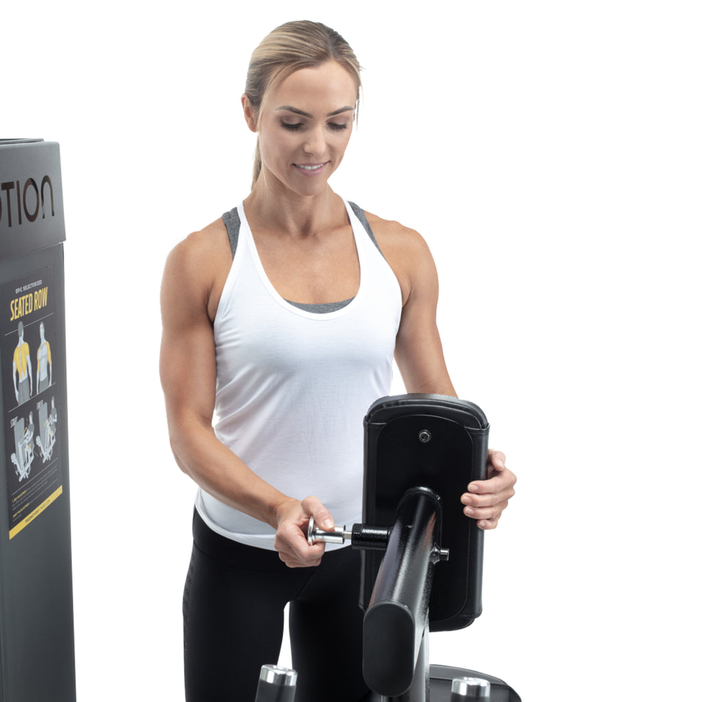 Maszyna została wyposażona w ergonomiczne siedzisko oraz profilowane podpórki pod klatkę piersiową, które zapewniają stabilne podparcie tułowia i komfort nawet podczas intensywnych serii. Regulowane elementy kontaktowe umożliwiają dopasowanie pozycji do Twojej sylwetki, co ułatwia utrzymanie prawidłowej techniki przez cały czas trwania ćwiczenia. Miękkie i trwałe materiały tapicerki zwiększają wygodę i pozwalają skupić się wyłącznie na pracy mięśni.
