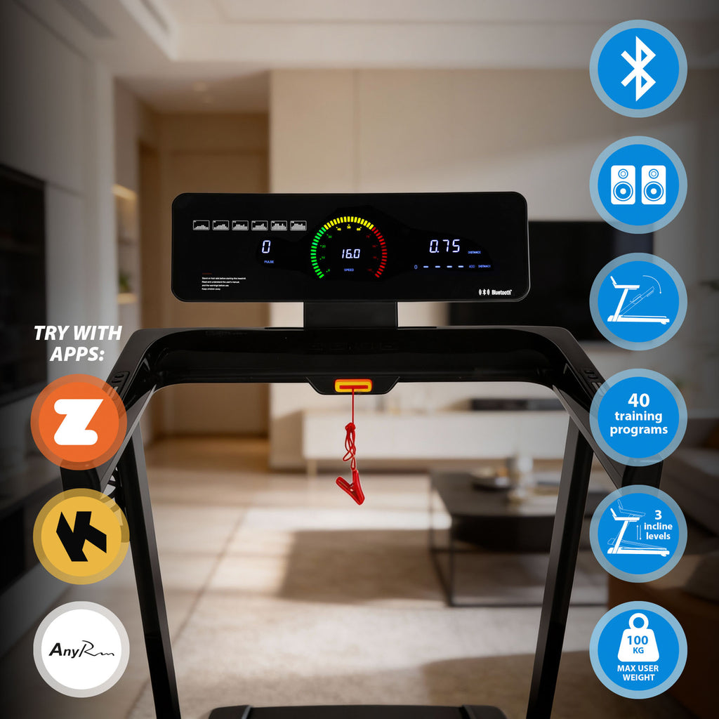 Bieżnia HMS BE5872N to nowoczesne urządzenie treningowe stworzone z myślą o domowym cardio na wysokim poziomie. Dzięki łączności Bluetooth bieżnia współpracuje z popularnymi aplikacjami treningowymi Kinomap, Zwift oraz AnyRun. To idealne rozwiązanie dla osób, które chcą trenować skutecznie, nowocześnie i bez monotonii.