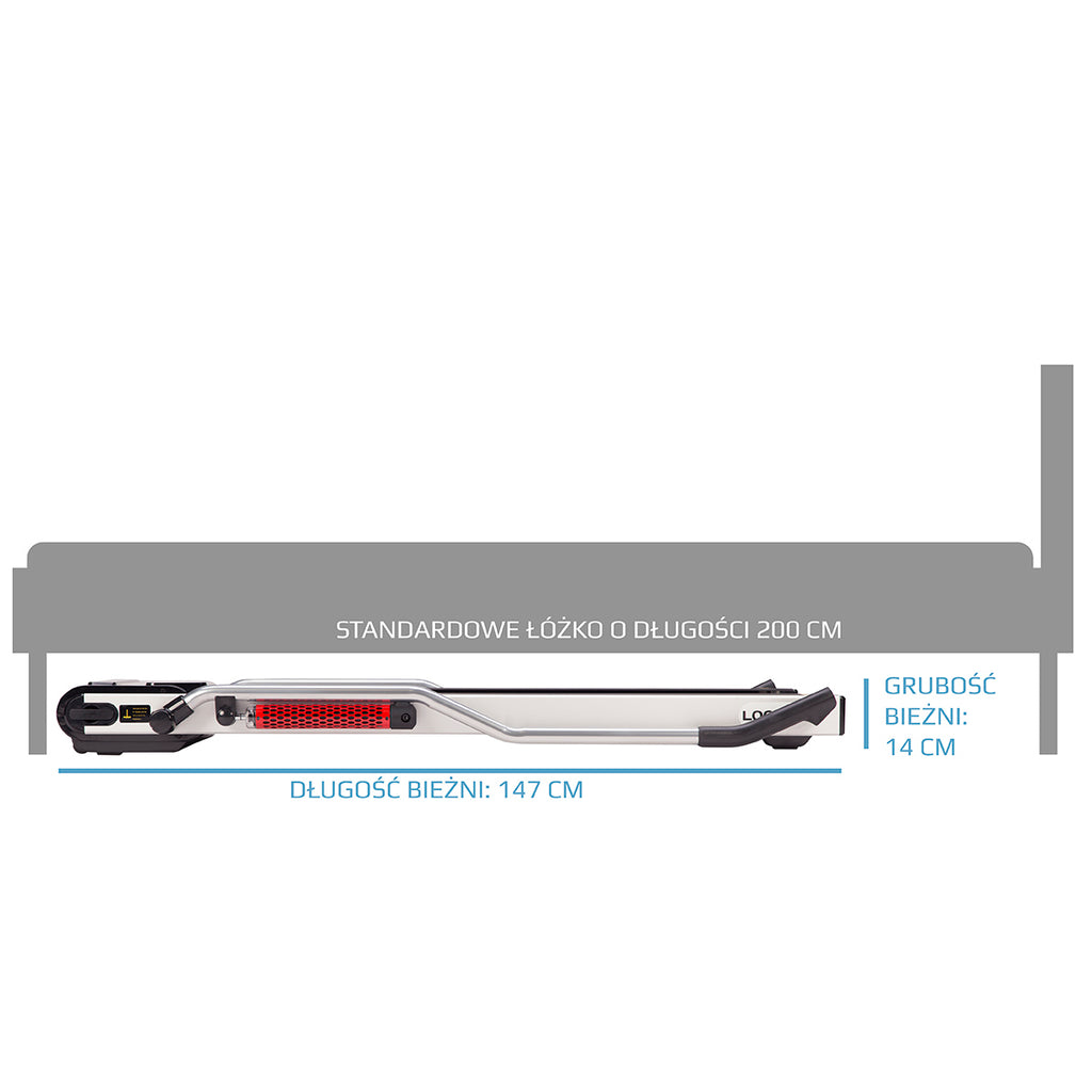 Bieżnia LOOP15, została wykonana z najwyższej jakości materiałów, a dodatkowo przyciąga nowoczesnym designem. Jej niewątpliwym atutem są wymiary, po złożeniu kolumn, produkt ma zaledwie 14 cm wysokości. Bez problemu, zmieści się np. pod łóżko. Przestawianie sprzętu, również nie będzie problemem, dzięki zamontowanym kółkom transportowym, bez specjalnego wysiłku ustawimy bieżnie w dogodnym miejscu.