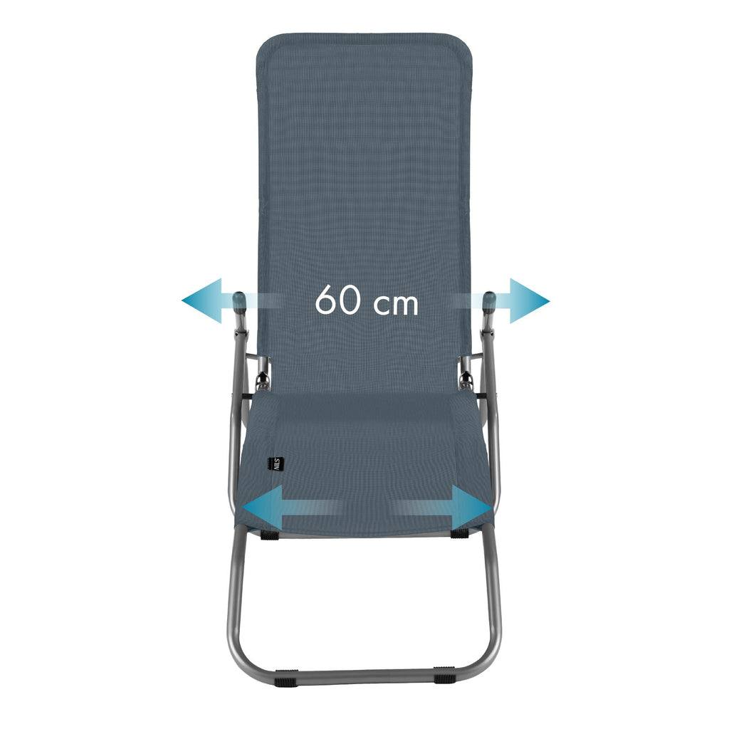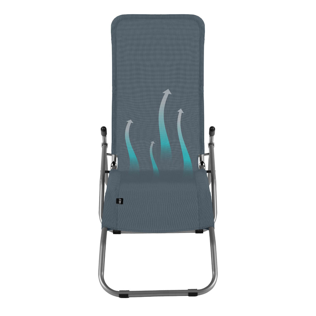Leżak NC3017 posiada przewiewną strukturę materiału, która gwarantuje swobodny przepływ powietrza, co zwiększa komfort użytkowania w upalne dni. Dzięki płynnej zmianie nachylenia, użytkownik zmienia pozycję z siedzącej na leżącą na zasadzie balansu (środka ciężkości), bez dodatkowych mechanizmów. Tylna podpórka natomiast zabezpiecza użytkownika przed nadmiernym nachyleniem.