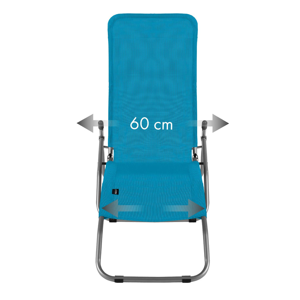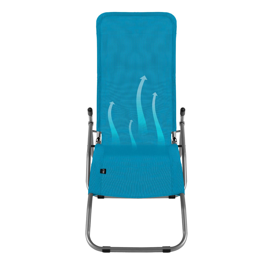 Leżak NC3017 posiada przewiewną strukturę materiału, która gwarantuje swobodny przepływ powietrza, co zwiększa komfort użytkowania w upalne dni. Dzięki płynnej zmianie nachylenia, użytkownik zmienia pozycję z siedzącej na leżącą na zasadzie balansu (środka ciężkości), bez dodatkowych mechanizmów. Tylna podpórka natomiast zabezpiecza użytkownika przed nadmiernym nachyleniem.