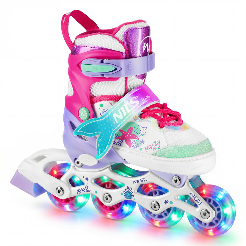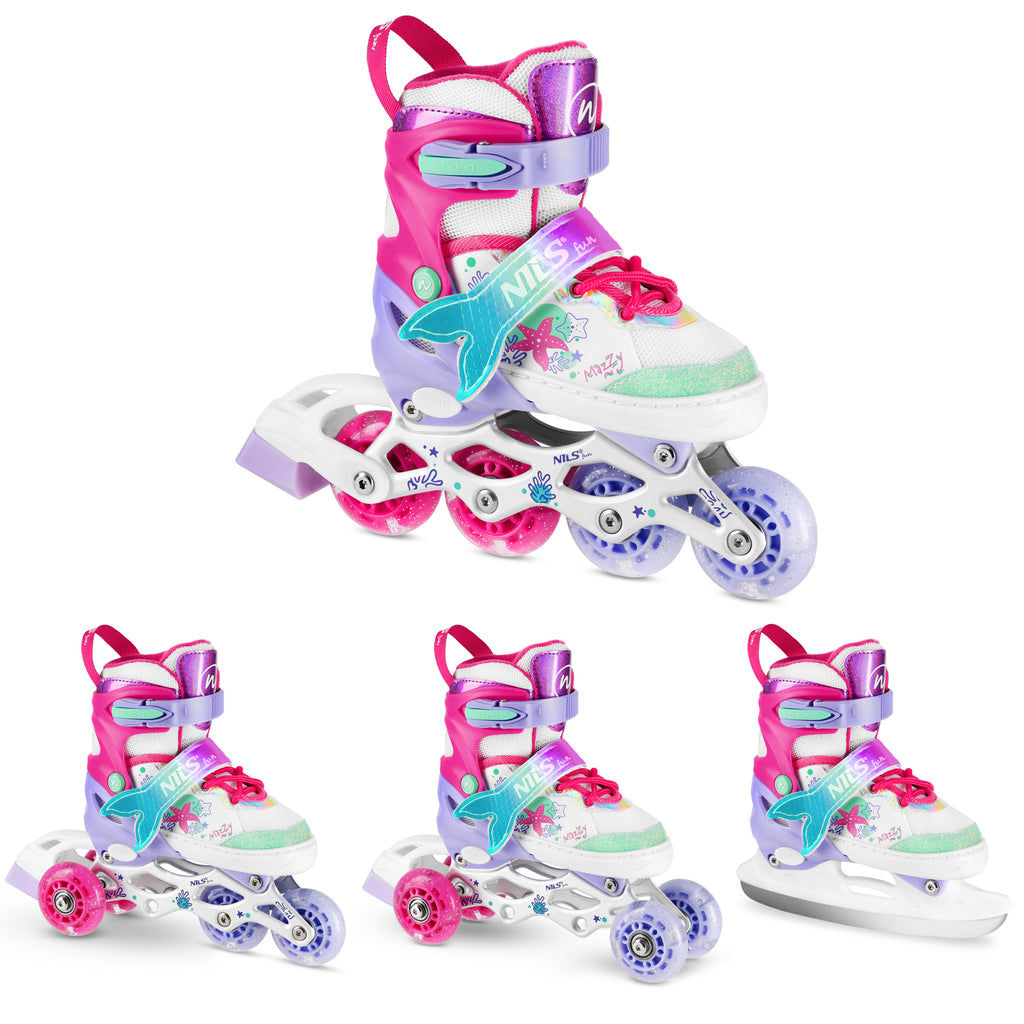 NH18150 MAZZY marki NILS FUN to wyjątkowy zestaw 4w1, który łączy funkcjonalność, bezpieczeństwo i atrakcyjny, bajkowy design inspirowany podwodnym światem. Model został zaprojektowany z myślą o dzieciach i młodzieży, które chcą aktywnie spędzać czas przez cały rok, a jednocześnie wyróżniać się stylem. Jeden produkt oferuje aż cztery konfiguracje - łyżworolki, łyżwy, wrotki oraz rolko-wrotki - dzięki czemu sprawdza się zarówno zimą, jak i w sezonie letnim.