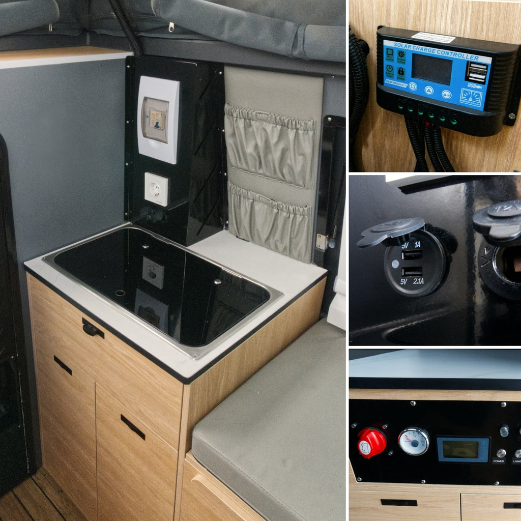Za zasilanie odpowiada panel solarny 150 W, który ładuje akumulator przez kontroler MPPT. Na pokładzie pracuje akumulator o pojemności 150 Ah, co zapewnia solidny zapas energii poza siecią. Masz dostęp do przetwornicy 3000 W z możliwością ładowania akumulatora z sieci na postoju. Do dyspozycji są gniazda 230 V, 12 V oraz porty USB. Panel sterowania pozwala kontrolować wszystkie funkcje jednym dotknięciem i informuje o stanie wody oraz poziomie naładowania akumulatora. W zestawie znajduje się pompa wody oraz demontowalny prysznic zewnętrzny.