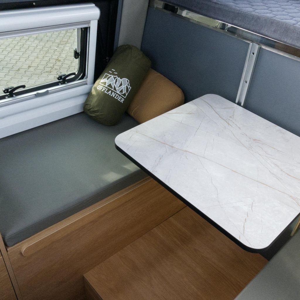 W środku znajduje się składany stolik, który można przekształcić w dodatkowe łóżko. Jest też dodatkowy właz otwierany z zewnątrz. Przestrzeń bagażowa została dobrze rozplanowana: dwie bakisty pod siedzeniami, dwie szafki nad nimi oraz miejsce przewidziane na lodówkę lub stolik. Dzięki większym wymiarom ATAKAMY XL wszystkiego jest po prostu więcej – więcej przestrzeni, więcej schowków i większy komfort codziennego życia w trasie.