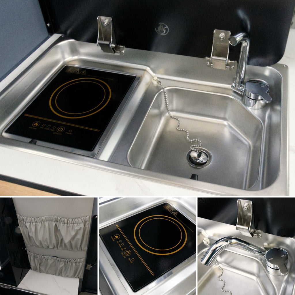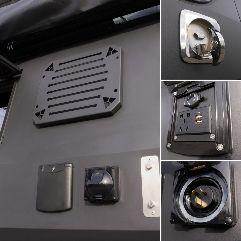 Za energię odpowiada panel solarny 150 W współpracujący z kontrolerem MPPT. Energia magazynowana jest w akumulatorze 150 Ah. Na pokładzie znajduje się przetwornica 3000 W z funkcją ładowania akumulatora z sieci na postoju. Dostępne są gniazda 230 V, 12 V oraz porty USB. Panel sterujący pozwala na obsługę wszystkich funkcji w jednym miejscu i pokazuje poziom wody oraz stopień naładowania akumulatora. W zestawie jest pompa wody oraz zdejmowany prysznic zewnętrzny, który można wygodnie przechowywać w zewnętrznym schowku lub bakistach.