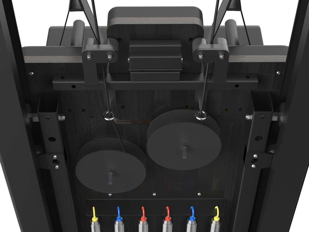Sercem konstrukcji jest zestaw sześciu hartowanych sprężyn z wysokowęglowej stali (2 mocne, 2 średnie, 2 lekkie), wykonanych z niemieckiego drutu najwyższej jakości. Takie rozwiązanie gwarantuje trwałość, odporność i powtarzalne parametry nawet podczas intensywnego, codziennego treningu na łóżku do pilatesu PTX8000.